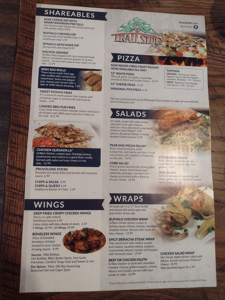 Introducing The Trailside, a delightful dining spot located at 108 W Main St, West Newton, PA. This cozy establishment is perfect for those seeking comforting meals after an adventure or a leisurely day out. The menu boasts an enticing selection of wraps, including the flavorful Buffalo Chicken Wrap and the spicy Sriracha Steak Wrap, ranging from $9.99 to $13.99, catering to a variety of taste preferences.